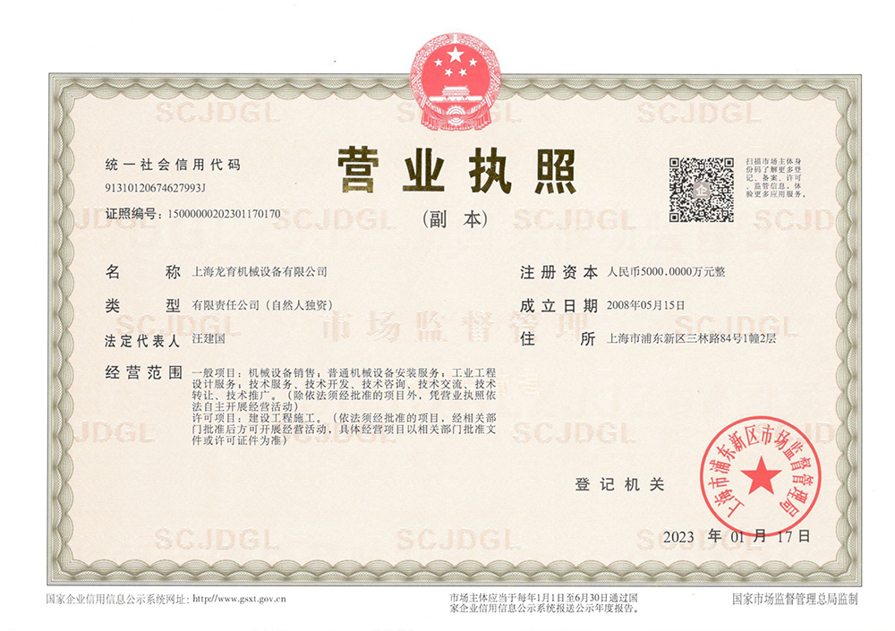 上(shàng)海龍(lóng)育機械設備有限公(gōng)司於2008年5月(yuè)成立,注冊資金5000萬元,並於2017年成立寧波17.c-起草网登录网站機械設備有(yǒu)限公司。